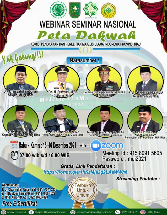 Pekanbaru – Komisi Pengkajian dan Penelitian Majelis Ulama Indonesia (MUI) Propinsi Riau taja Webinar Seminar Nasional Peta Dakwah, kegiatan tersebut berlangsung selama Dua hari yakni Rabu dan Kamis 15 dan 16 Desember 2021.